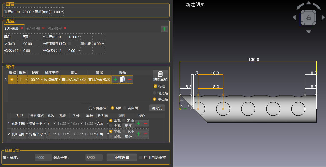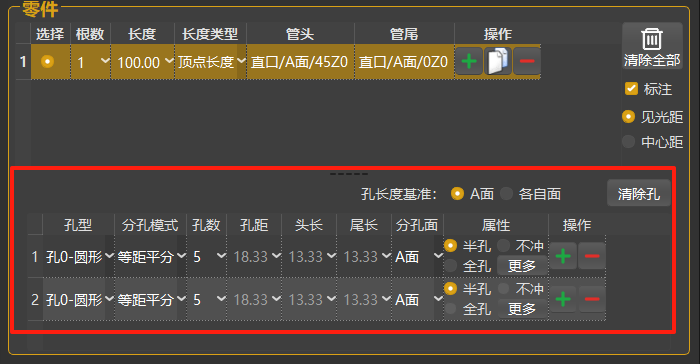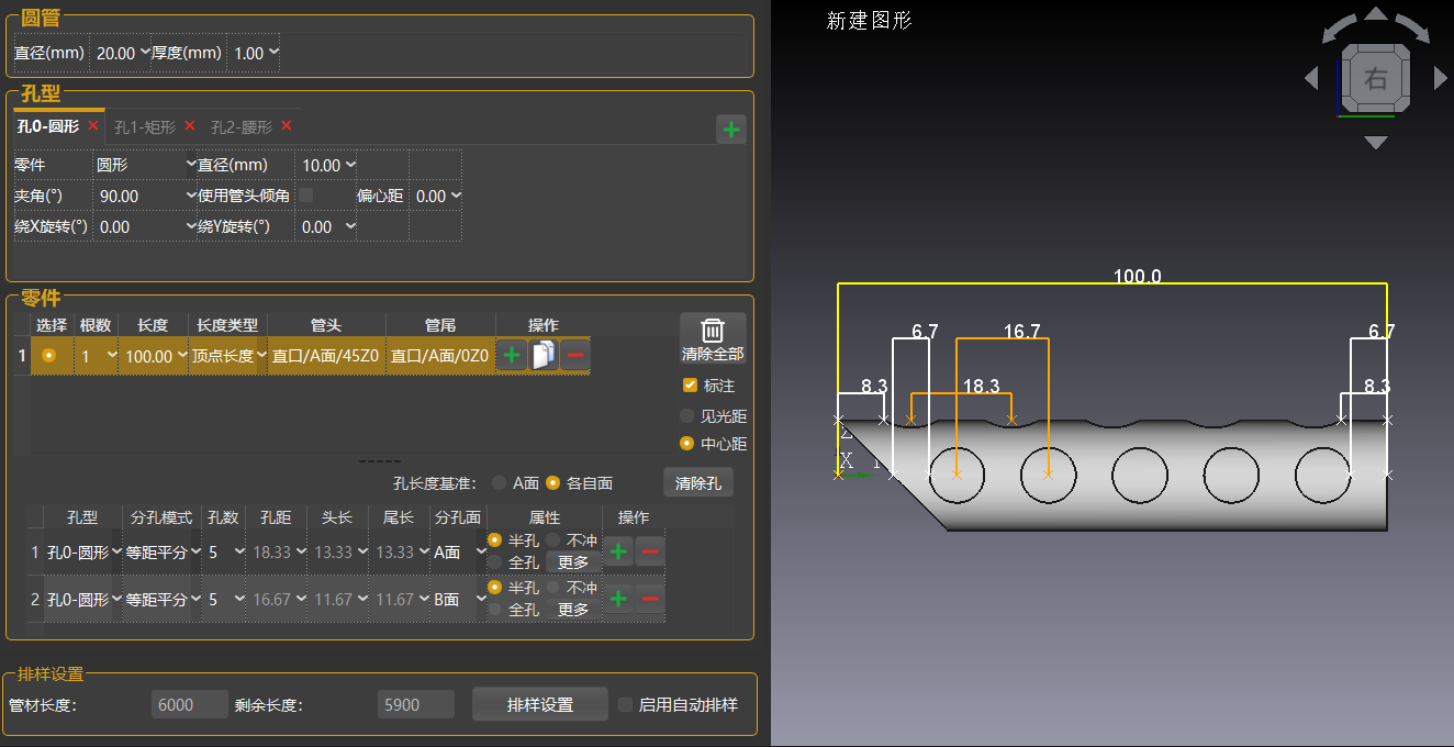 多孔距:固定管头长度,设置孔数及孔距,自动计算管尾长度。