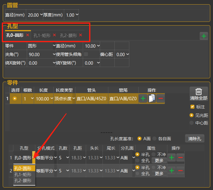 下拉选择已配置好的孔型。